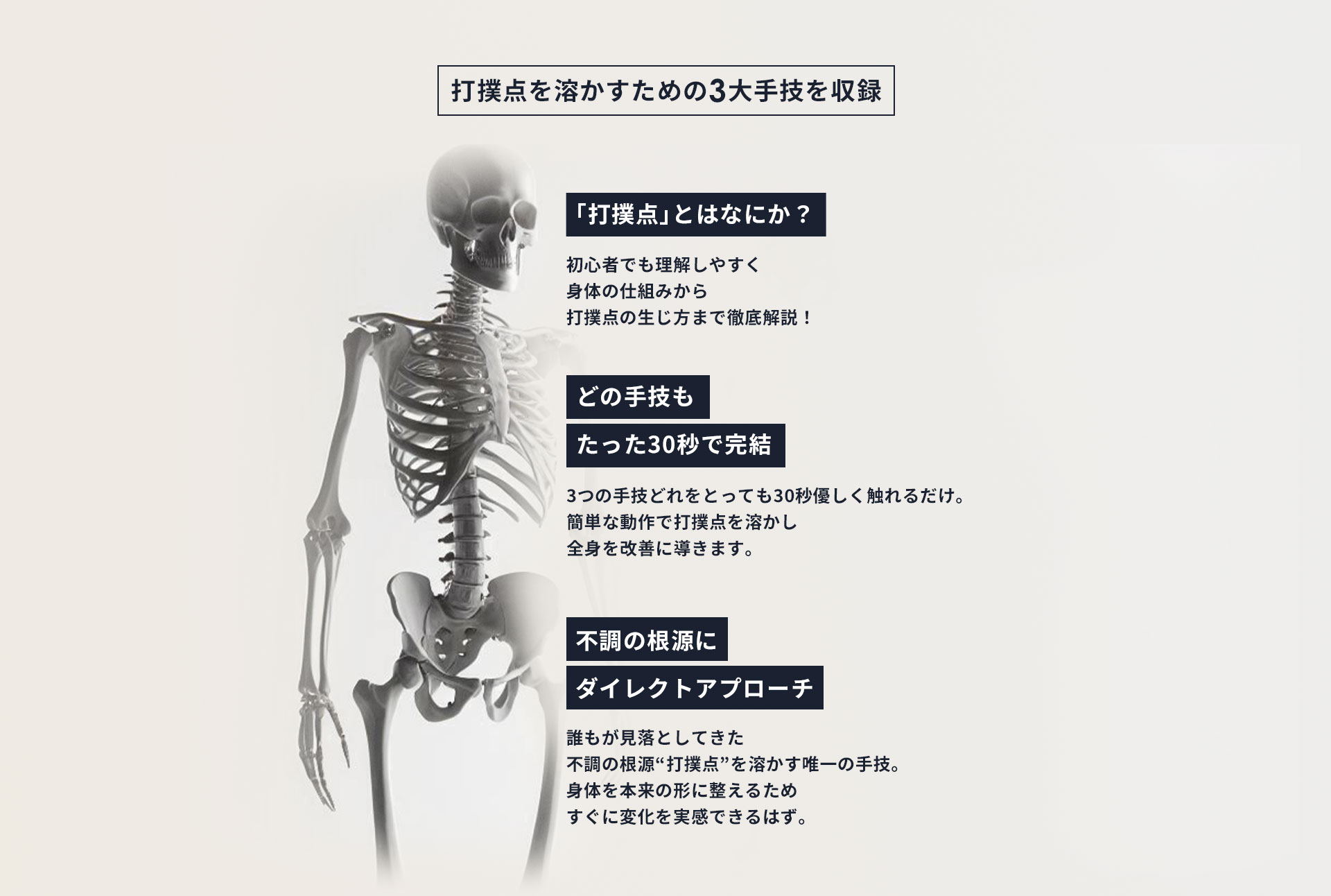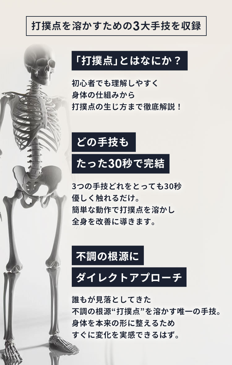 身体に詳しくない素人さんでも“打撲点”を発見し溶かす方法をしっかり収録しました。