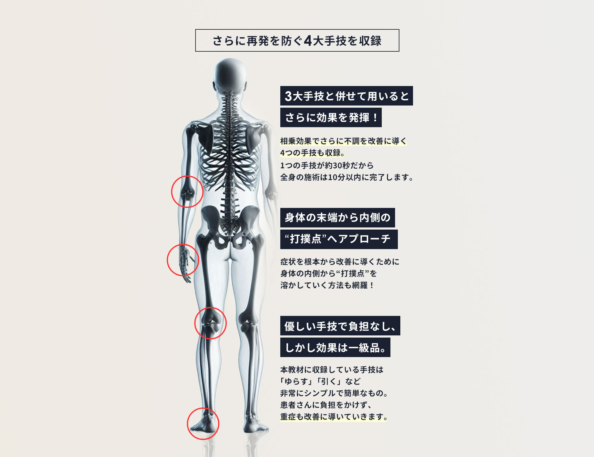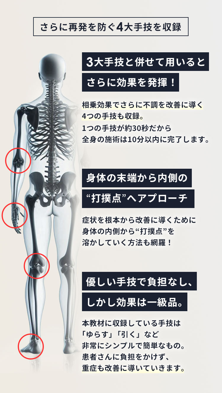 「自分の身体の症状をケアしたい」と手技を学んでいる方も多いはず! そんな声にお応えします。 場所を選ばず、いつでもどこでも自分の不調がケアができるように、1人でも打撲点を溶かせる方法をプレゼント。 もちろん患者さんにお伝えしてもOKです。