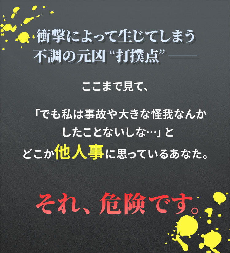 日常生活の中で、誰もが身体をぶつけることはありますね。実はその衝撃で急性の打撲点は生まれてしまいます。 放置していると慢性化して、気づかぬうちに身体の不調のもとに…。