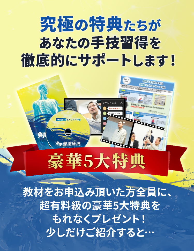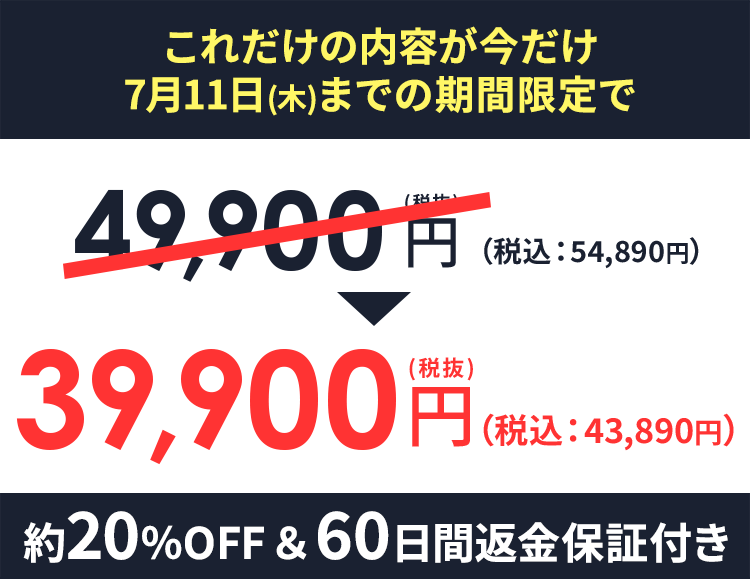 | 合計 超豪華教材プログラムに ココでしか手に入らない5個もの特典を無料でお付けして → 39,900円 (税込43,890円) |