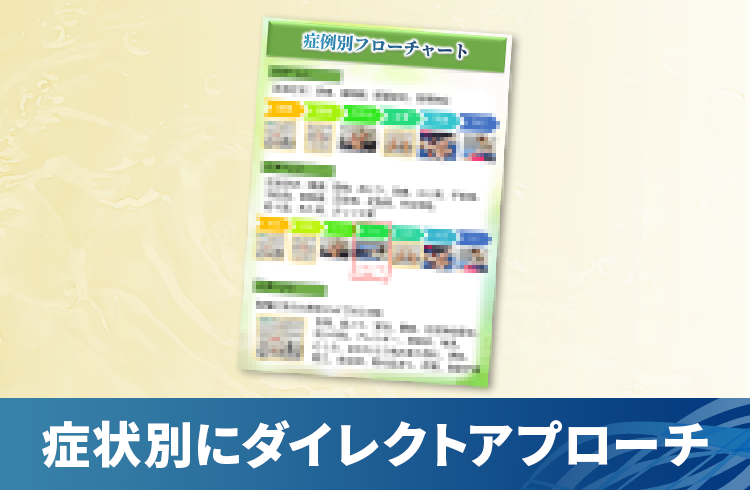 「こんな症状にも効きますか?」と寄せられた質問から、基本の手順を症状別にアレンジしフローチャート化。臨床で迷った際にもすぐに使えるので施術のお守りになるでしょう。