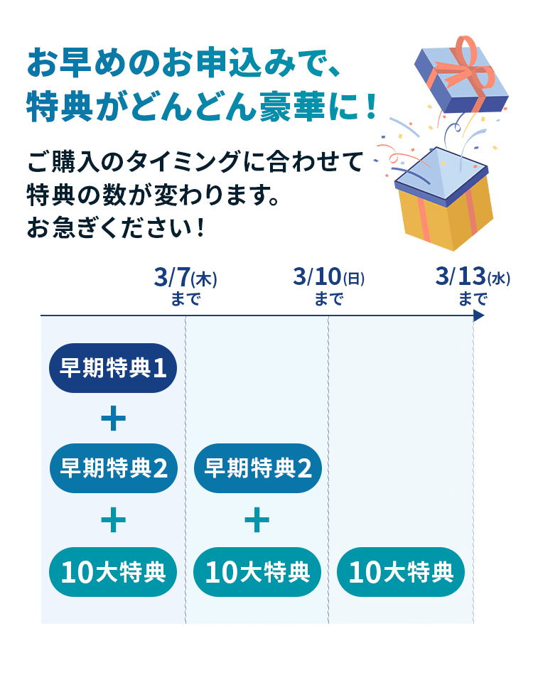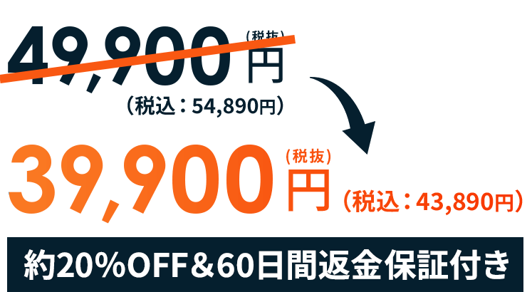 | 合計 超豪華教材プログラムとここでしか手に入らない 豪華10大特典をお付けして → 39,900円 (税込43,890円) |