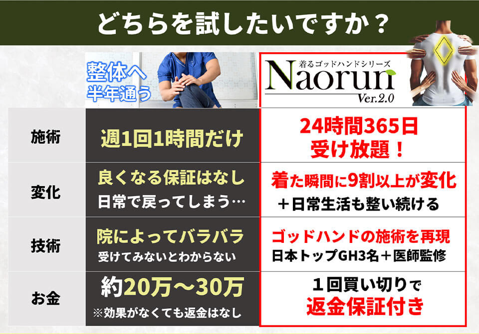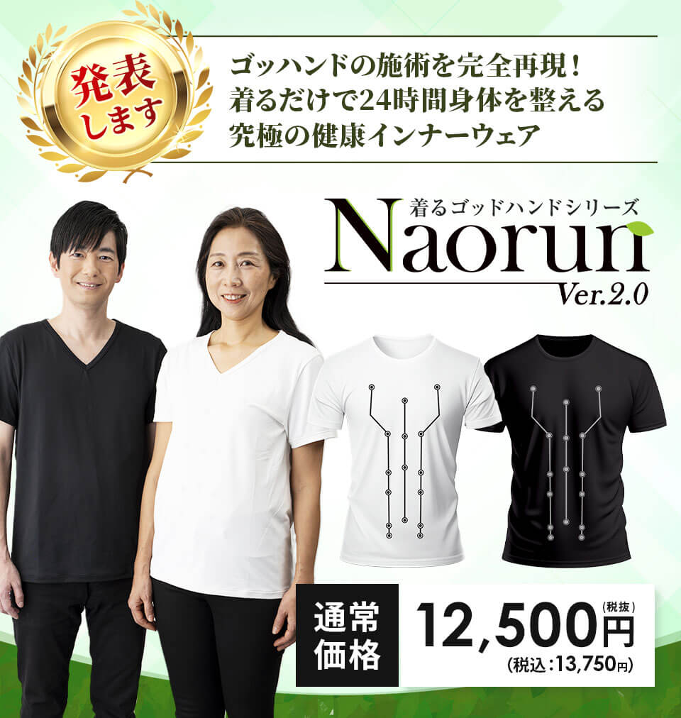 強く矯正するというよりもまさに《着るゴッドハンド》で自然と姿勢がスッと綺麗になったり、背中がスッと伸びる感覚があって、本当に驚きでした。着用するだけでゴッドハンドの施術を受けている感覚…この体感があるからこそ、このNaorunはもう手放せません。