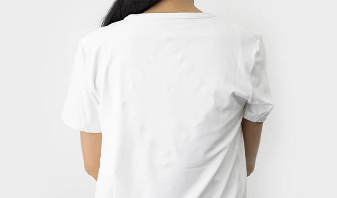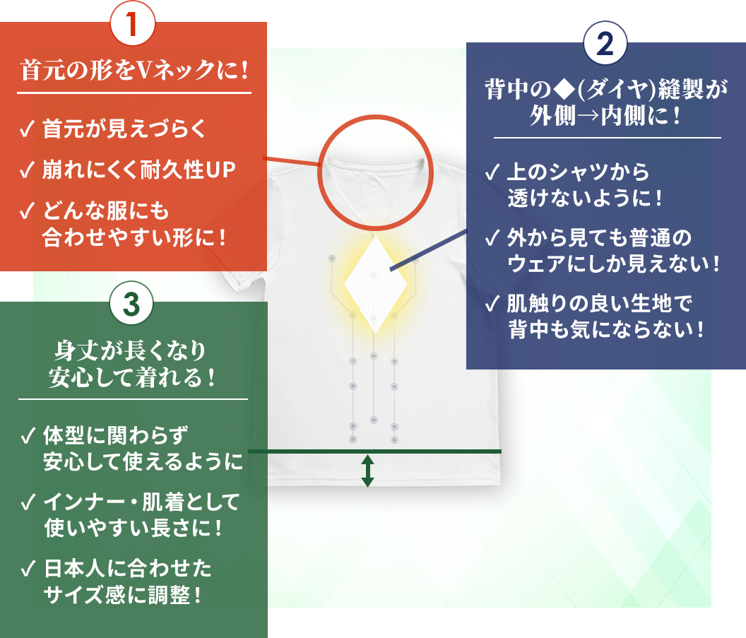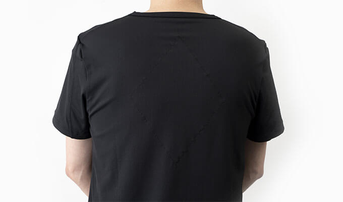 背中の◆などしっかりと縫製しておりますので、一般的なインナーと遜色なく着続けることができます。伸縮性と耐久性は前回のものより高くなっておりますので、着続けて洗濯しても効果が落ちづらくなっています。
