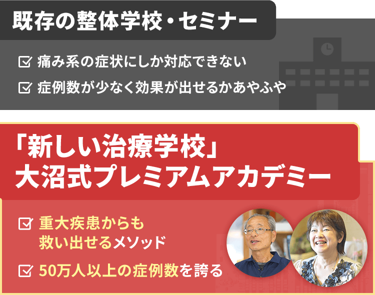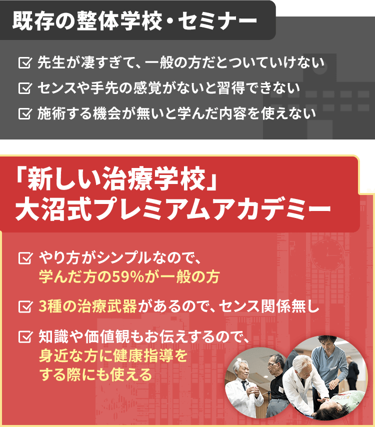 圧のかけ方、方向、患者さんに応じた施術のやり方を手取り足取り伝授するので、大沼先生並の効果を出せるようになるでしょう。