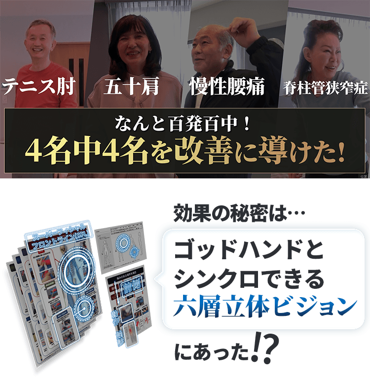 しかし、六層立体ビジョンを使って施術したところ、たった1回の施術で歩けるように!